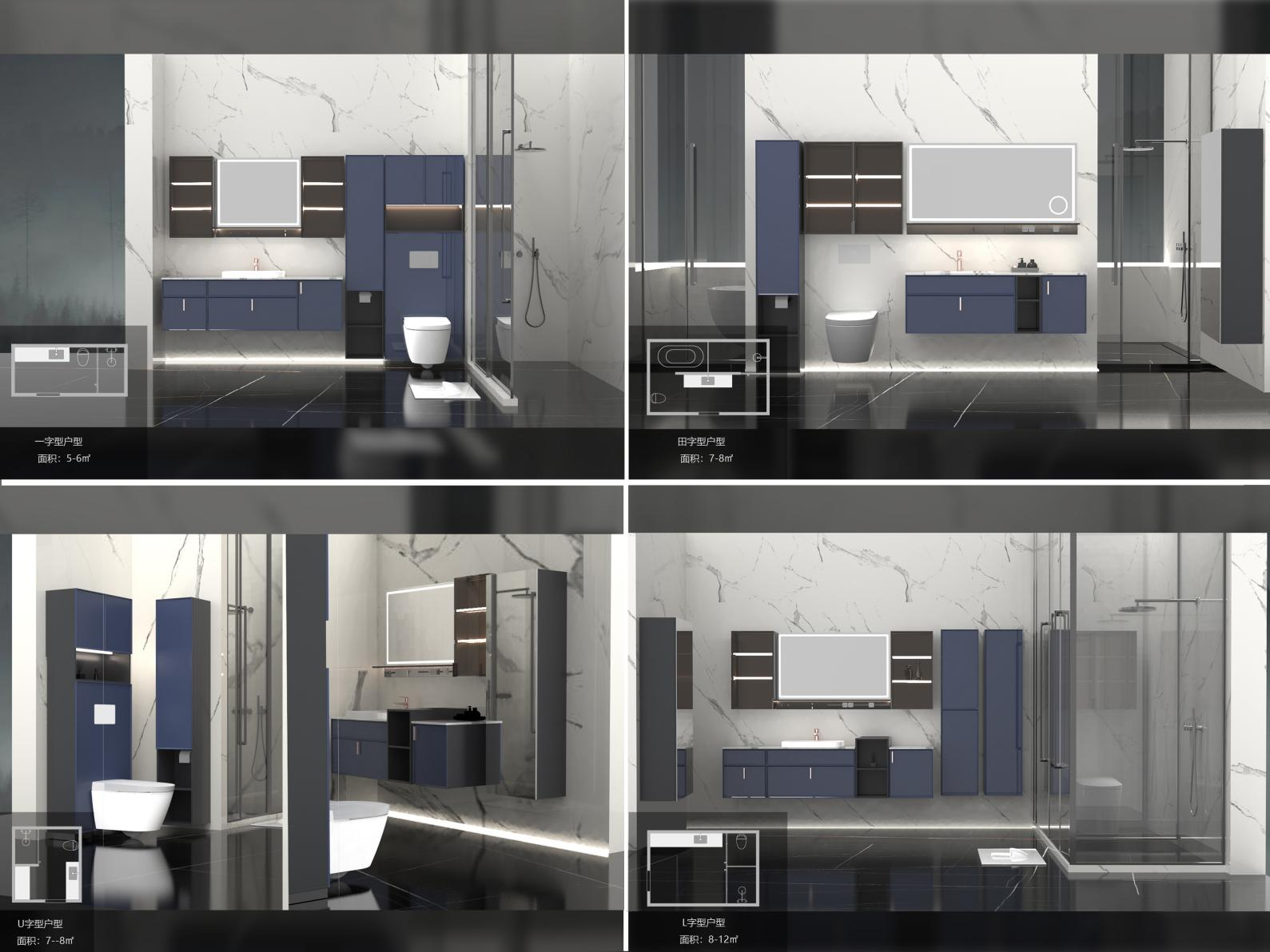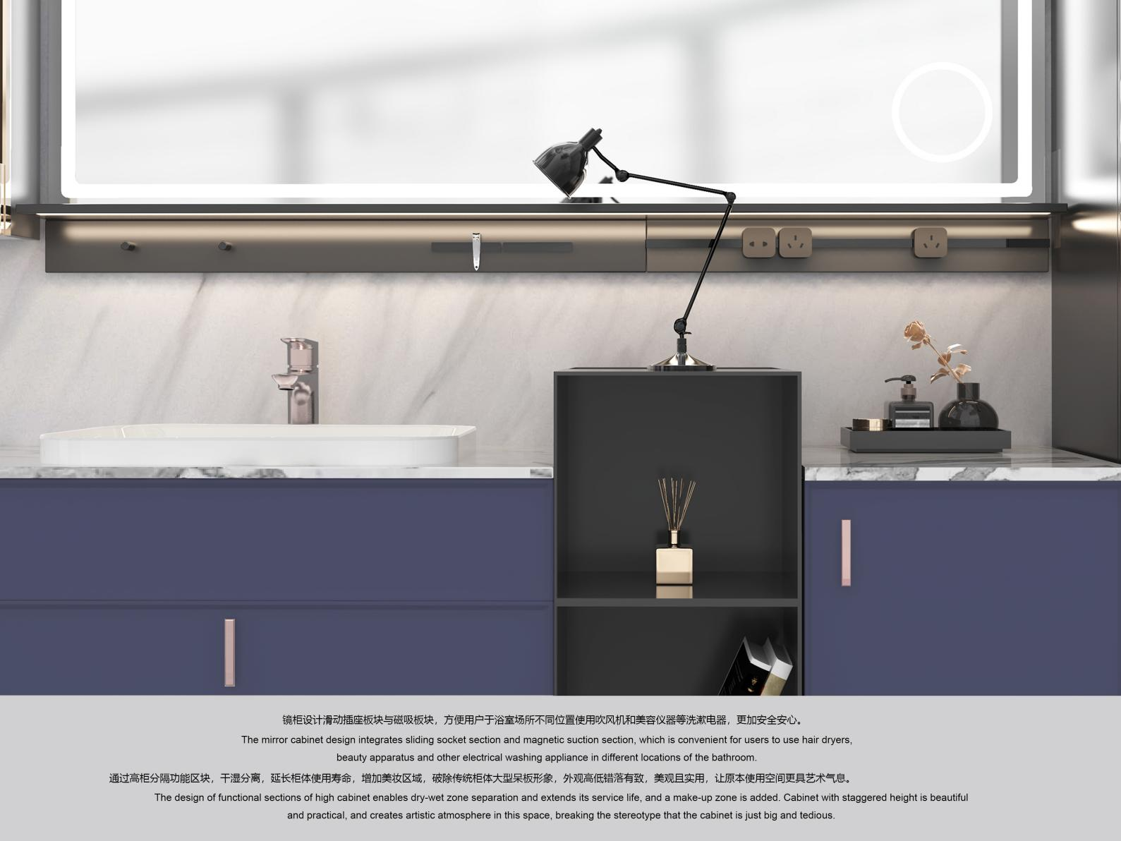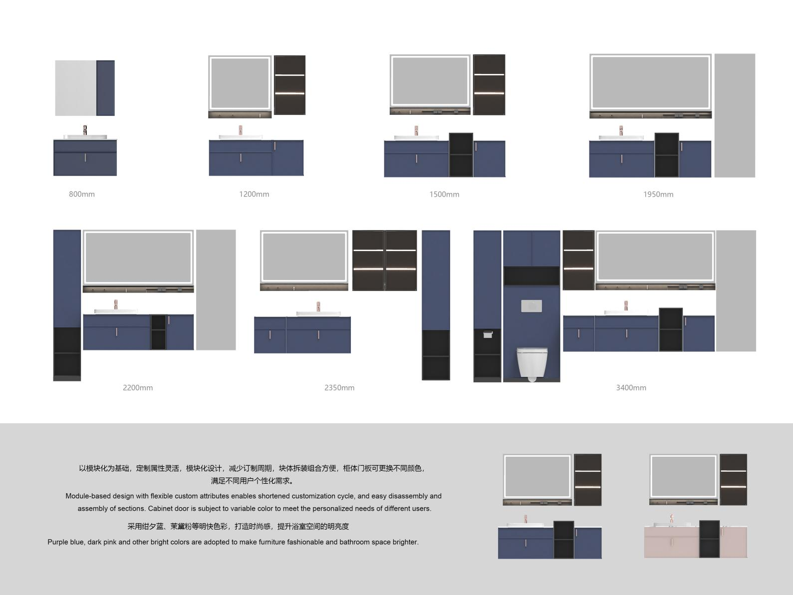 西雅图系列定制浴室家具项目着重在用户体验,功能创新上进行了全方位的深入思考,产品致力为用户提供一个优雅、浪漫、个性化的现代美式定制卫浴空间,在材料、功能、人机交互上进行了深入研究与应用:1,镜柜设计滑动插座板块与磁吸板块,方便用户于浴室场所不同位置使用吹风机和美容仪器等洗漱电器,同时防水滑盖设计,更加安全安心 。2,超大智能镜面结合多处氛围灯、采用铝合金玻璃包边柜门等时尚设计材料,现代科技感十足。3,柜体分隔设计:通过高柜分隔功能区块,干湿分离,延长柜体使用寿命,增加美妆区域,破除传统柜体大型呆板形象,外观高低错落有致,美观且实用,让原本使用空间更具艺术气息。4,在分隔柜后部置入吹风底座,方便放置吹风与电器,巧妙且隐密,且取用方便,用户可随意在美妆区与盥洗区拿取使用。5,入墙马桶一体柜设计,针对想要装入墙式马桶又不想破坏墙体结构的人群,板材替代墙面 解决入墙马桶不易于拆除维修问题。底部采用踢脚线式金属板设计,外观更有质感,并能够防止柜体受潮。6,全身镜柜设计,解决消费者洗浴时无处放置换洗衣物的痛点,满足爱美人士使用需求。7,以模块化为基础,定制属性灵活,模块化设计,减少订制周期,块体拆装组合方便,柜体门板可更换不同颜色,满足不同用户个性化需求。8,采用绀夕蓝、茉黛粉等明快色彩,打造时尚感,提升浴室空间的明亮度。