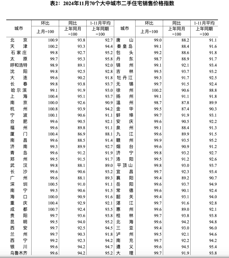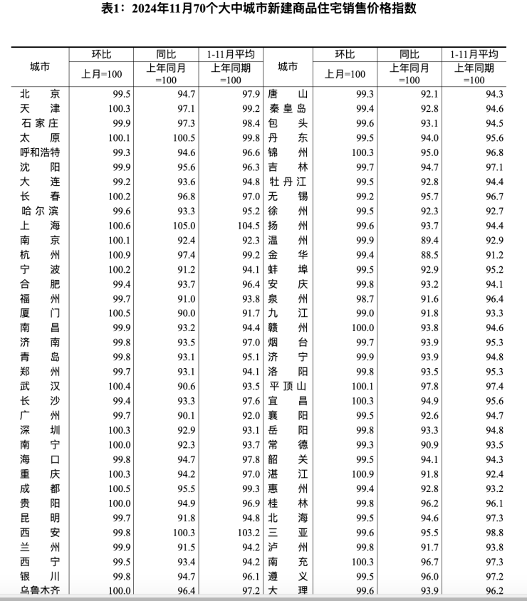 2024年11月份,70个大中城市中,商品住宅销售价格环比上涨城市个数增加,一线城市商品住宅销售价格环比总体上涨,二三线城市环比降幅均收窄;各线城市同比降幅今年以来首次均收窄。