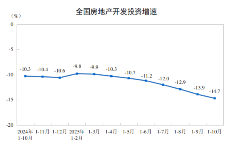 数据显示,1—10月份,全国房地产开发投资73563亿元,同比下降14.7%;其中,住宅投资56595亿元,下降13.8%。