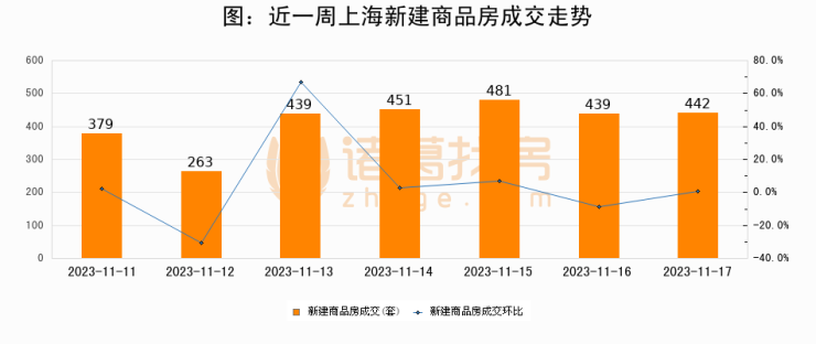根据上海市房地产交易中心数据显示,2023年11月17日上海新建商品房成交442套,较昨日增加3套,环比上涨0.7%
