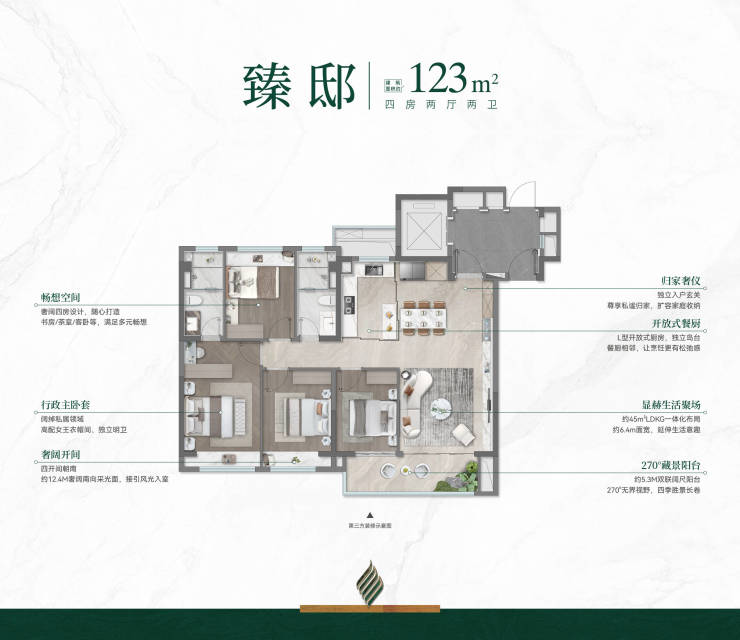 全能四房123㎡,约12.4m大开间正四房+约45m²LDKG一体化空间+一线家装品牌,从2人世界到5口之家,全生命周期完美满足;