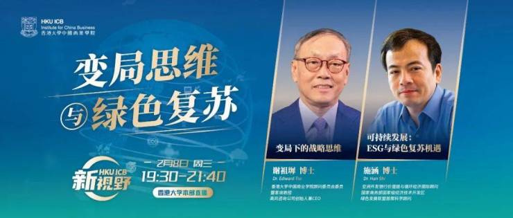 ICB新视野第二期主题为《变局思维与绿色复苏》。本次活动特邀香港大学中国商业学院顾问委员会委员暨客席教授、高风咨询公司创始人兼CEO谢祖墀博士;亚洲开发银行价值链与循环经济国际顾问、国家商务部国家级经济技术开发区绿色发展联盟首席科学顾问施涵博士两位行业专家,分别就变局思维与可持续发展话题分享真知灼见。欢迎全国各地的校友及观众预约报名。