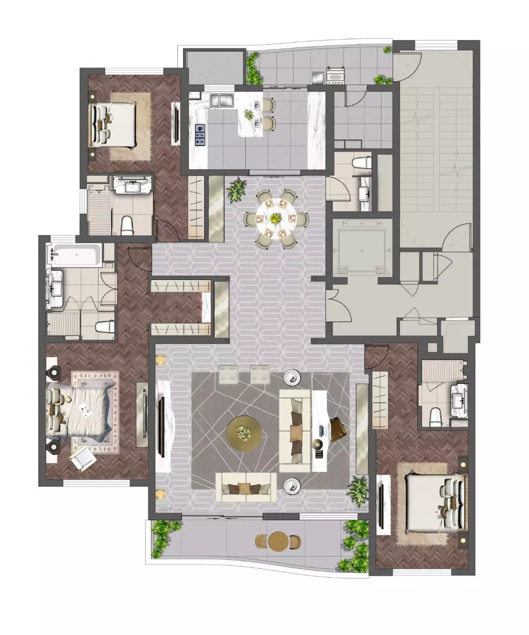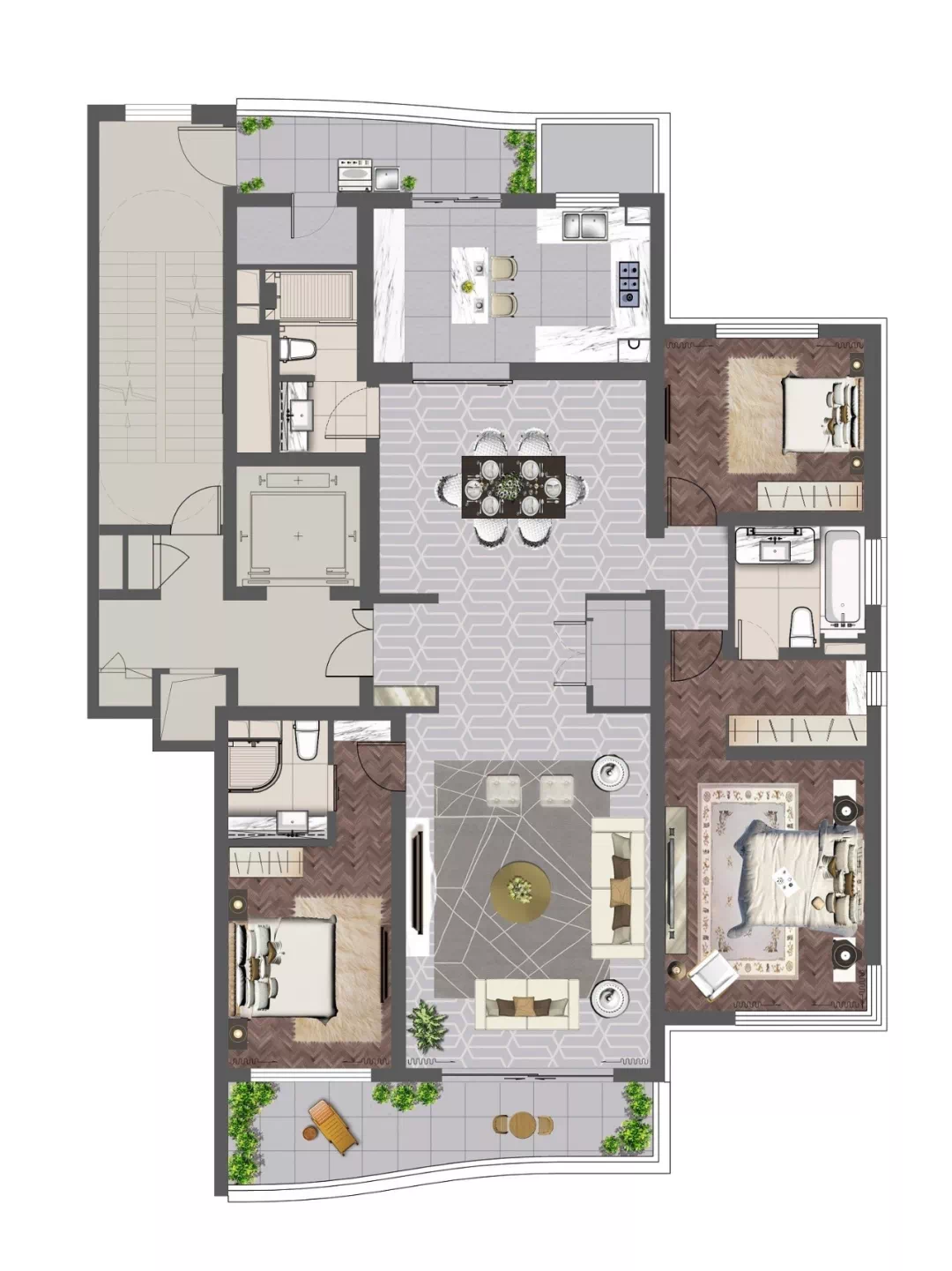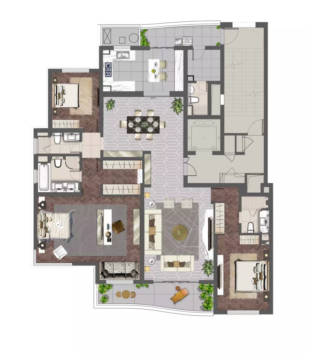 套房本身就是私密性强的体现,所以建面约252㎡户型甚至做到三套房+三独立卫生间,外加一个客人用的卫生间,可见项目对于私密性的苛刻要求!