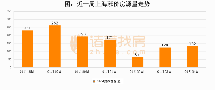 根据诸葛找房数据显示,上海24小时涨价房源量为132套,较01月23日增加8套,环比上涨6.5%。与此同时,涨价房源占比小幅扩大,业主信心有所提升。