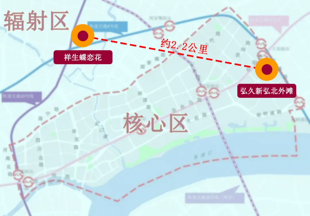 从下面地图上看,两个项目距离并不算远,直线仅约2.2公里。但所处的区位却并不相同,弘久新弘北外滩位于北外滩规划核心区内,而祥生蝶恋花则仅处于北外滩规划辐射区。