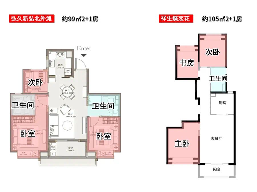 通过对比可以看出,同样的2+1房,弘久新弘北外滩却比祥生蝶恋花项目省出6个平方,而且户型格局优势更为突出。