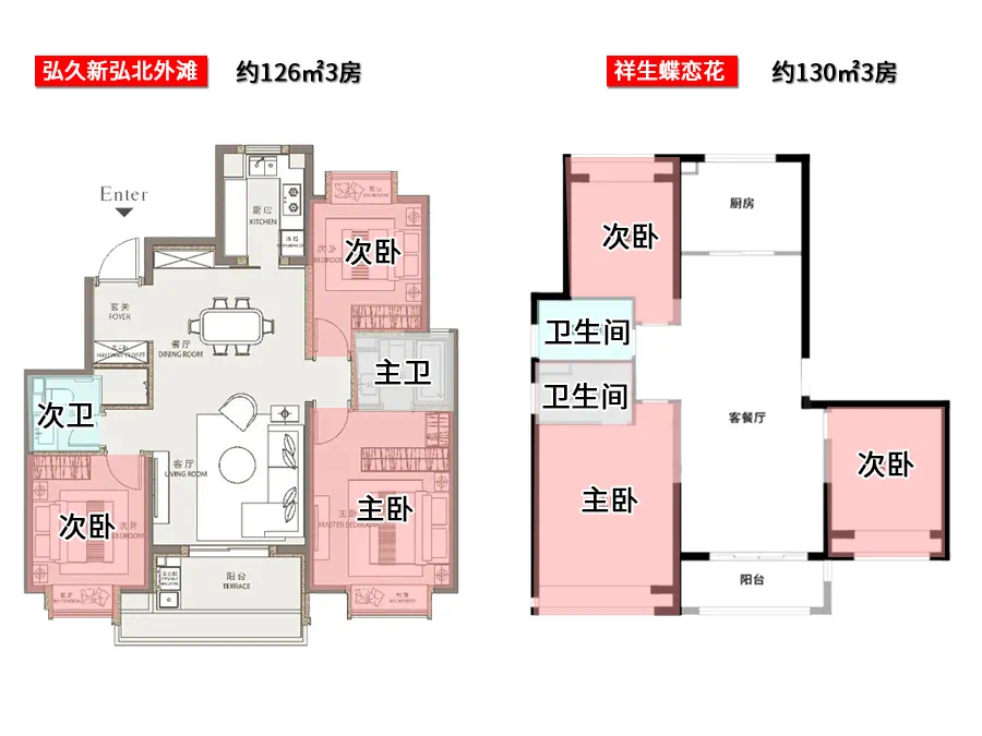 在130㎡左右这个面积段,弘久新弘北外滩及祥生蝶恋花主卧均采用既舒适又私密的套房设计,并且同样三开间朝南,南向卧室均带飘窗,不过相比于弘久新弘北外滩一左一右的卫生间布局,祥生蝶恋花就显得不太合理,因为位于右侧的次卧需跨过客厅才能到达位于另一侧的卫生间。