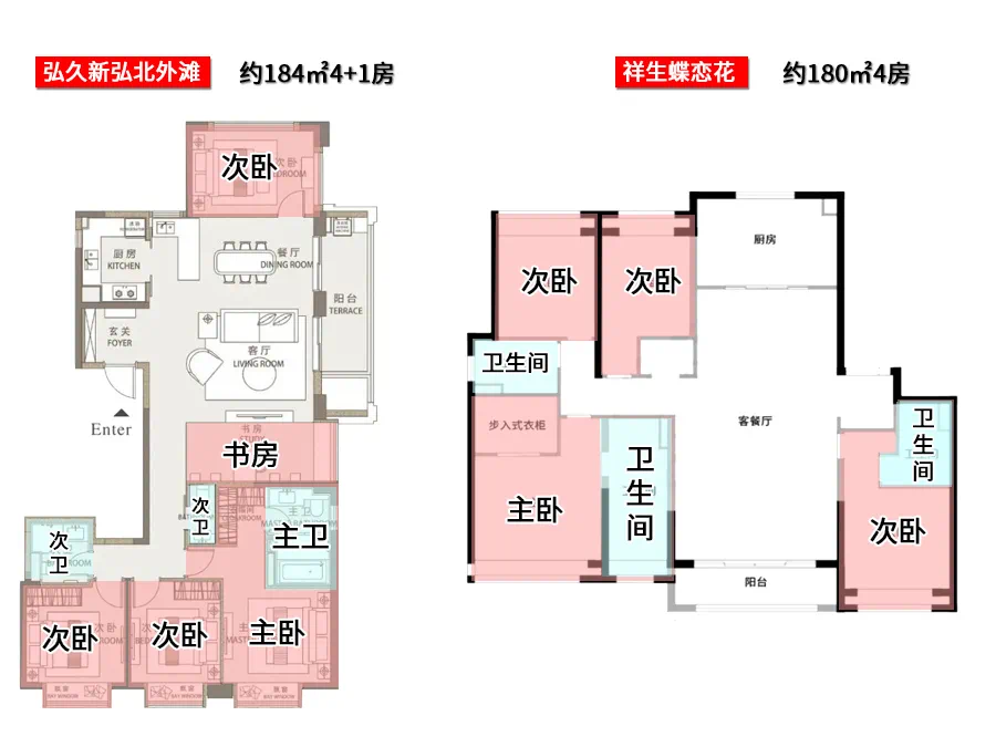 在180㎡左右这个面积段上,弘久新弘北外滩虽比祥生蝶恋花仅多出4㎡,但却也做出一个小房间,户型功能性更强的优势显而易见。
