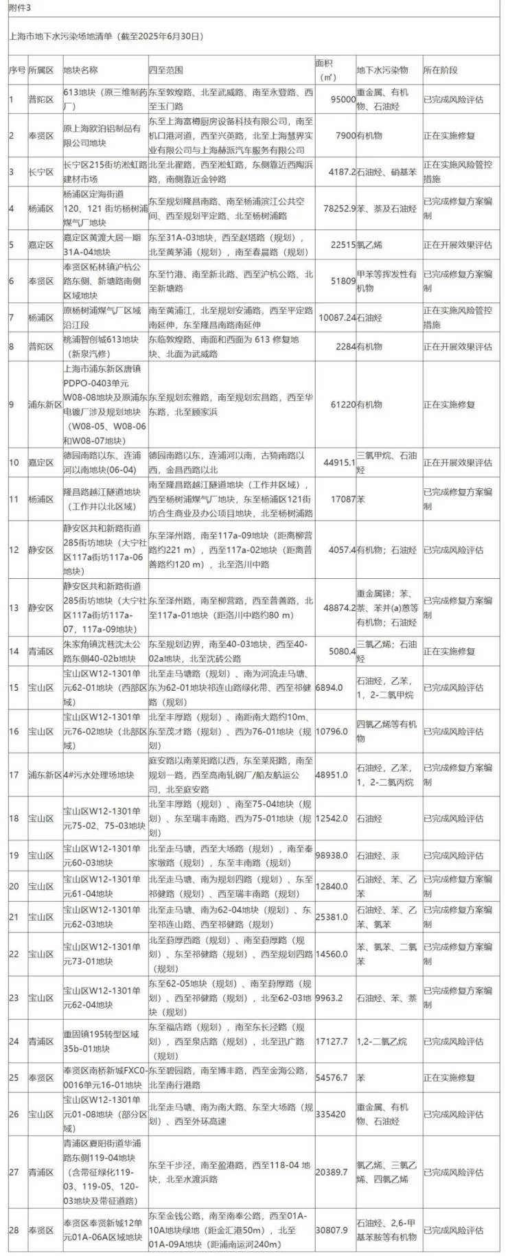 根据《中华人民共和国土壤污染防治法》《关于印发地下水污染防治实施方案的通知》(环土壤〔2019〕25号)有关要求,市生态环境局会同市规划资源局,结合本市土壤污染状况相关评审情况(截至2025年6月30日),对《上海市建设用地土壤污染风险管控和修复名录》(以下简称《名录》)和《上海市地下水污染场地清单》(以下简称《清单》)进行更新。更新后,《名录》共有48个地块(附件1、2);《清单》共有28个地块(附件3)。