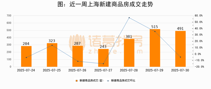 根据上海市房地产交易中心数据显示,2025年07月30日上海新建商品房成交491套,较昨日减少24套,环比下降4.7%