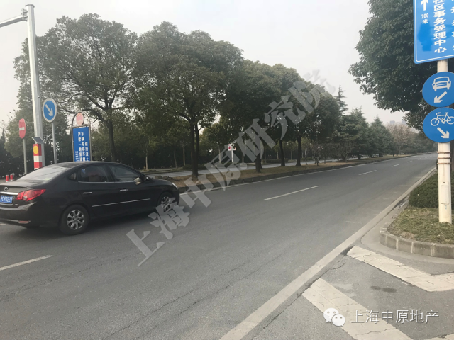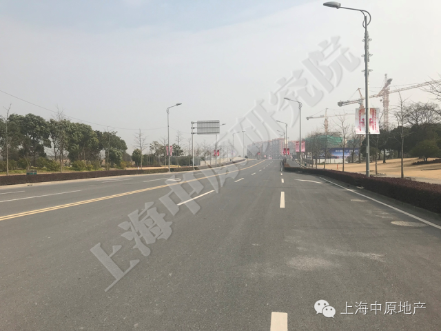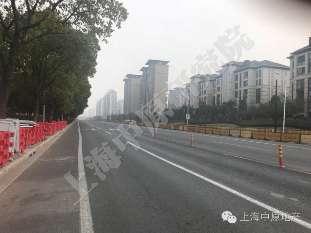 地块南面广富林路现状,道路正在施工,施工完毕后为双向四车道通行。