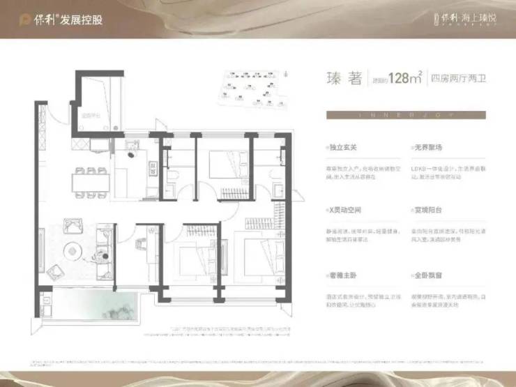 约128㎡4房,增加X百变空间,四开间朝南,尺度奢阔,动线及功能间分布合理,适合改善家庭进阶置业。
