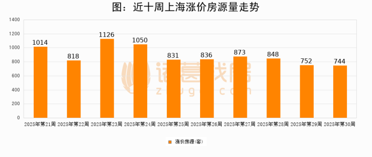 从调价房源来看,第30周上海涨价房源744套,较上周下降1.1%。与此同时,30周涨价房源占比回落0.21个百分点,业主信心小幅波动,购房者可则需入市。