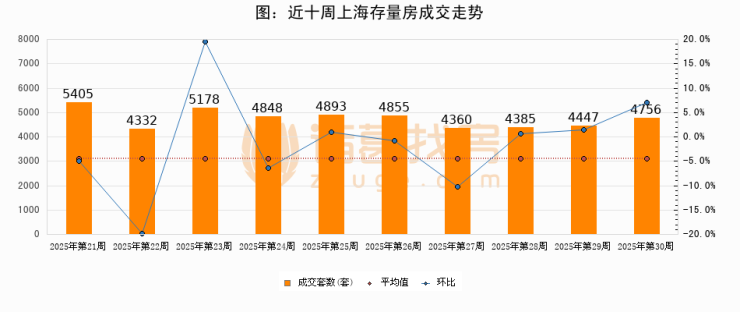 存量房方面,第30周上海存量房成交4756套,较上周增加309套,环比上涨7%。从近十周成交走势来看,周均成交套数为4745套,本周高于平均水平0.2%。