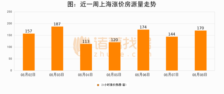 根据诸葛找房数据显示,上海24小时涨价房源量为170套,较08月07日增加26套,环比上涨18.1%。与此同时,涨价房源占比小幅扩大,业主信心有所提升。