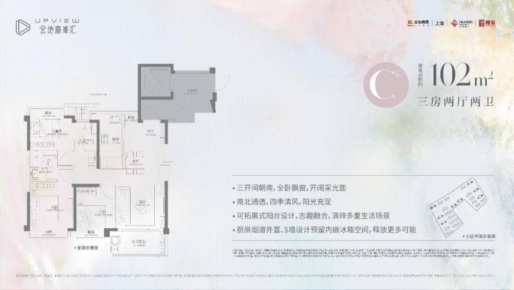 户型方面,素有“户型大师”之称的金地,在嘉峯汇项目上打造建面约89-102㎡的科学健康户型,客厅和次卧设计成可自由改造的非承重墙,客户可根据需求实现“不换房子换户型”的全生命周期体验,提升户型实用性,以及LDKB一体化、科学S墙、全卧飘窗等细节设计,增强空间感与舒适度。