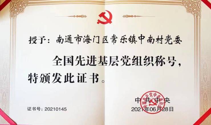 在中南集团董事局主席兼中南村党委书记陈锦石的带领下,中南村用实践走出了县域经济焕新发展的共同富裕路,并先后被评为全国文明村、全国绿色小康村、江苏省文明村。2021年6月28日,在中共中央庆祝建党100周年“两优一先”表彰大会,中南村党委荣获“全国先进基层党组织”称号。