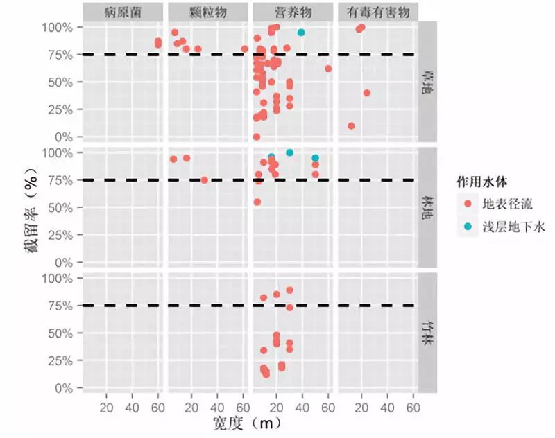 不同河岸植被类型的宽度与各类污染物截留率的关系