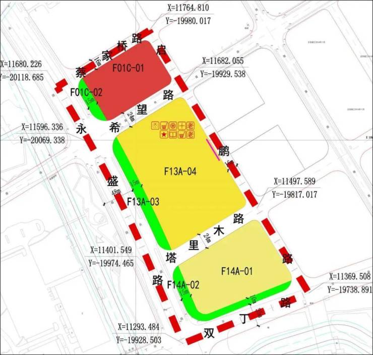 F13A-01、F13A-02地块:合并为F13A-04地块,由办公用地调整为三类住宅用地。容积率从3.20降至2.20,建筑高度维持60米。