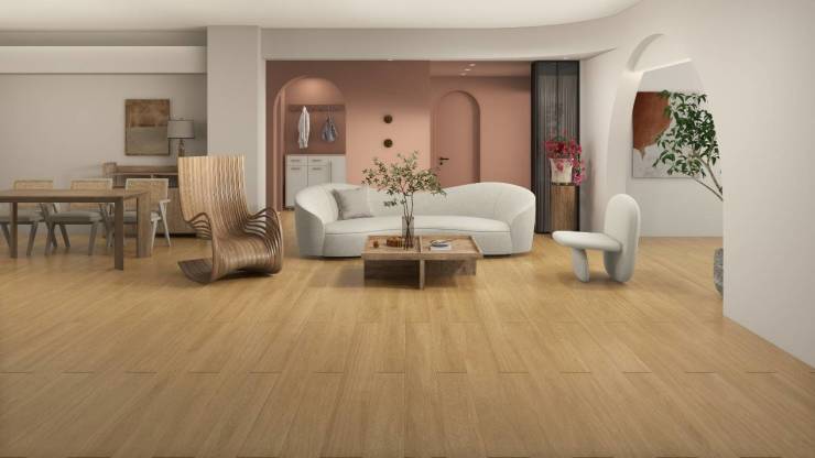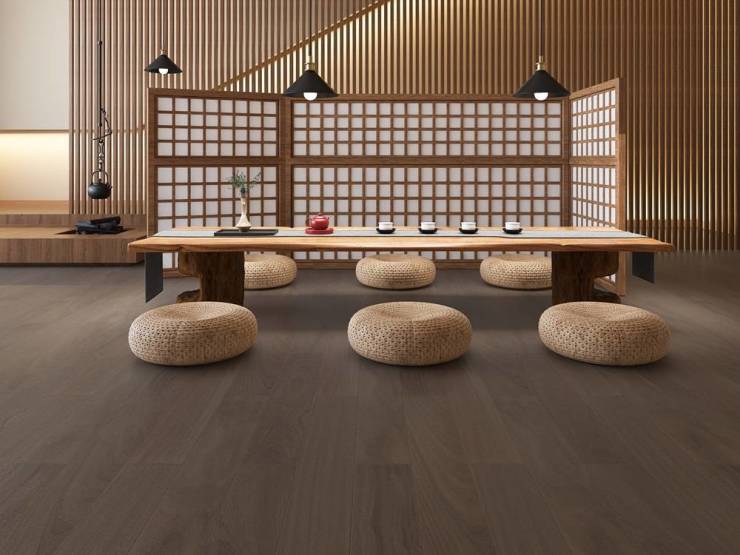精湛的工艺处理,既保留了木材天然的原始纹理,又增强了耐久性与抗变形能力,在地暖环境下依旧可以放心使用。这样的材质与侘寂风的追求不谋而合,不仅提供了实用的功能性,还为家居设计增添了一种低调的奢华感。