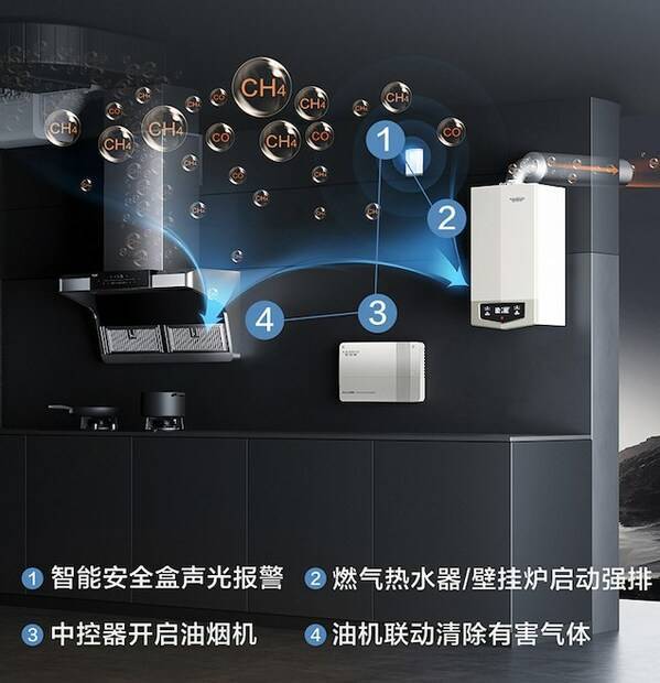 A.O. 史密斯自主研发"以人为中心"的全联全控智能物联系统——AI-LiNK,让原本孤岛式的家电产品实现互联。一旦监测到厨房内一氧化碳、甲烷超标,将自动开启油烟机和燃气热水器(需搭载AI-LiNK功能)排风,快速将有害气体排出室外,全天候智能守护家人安全。