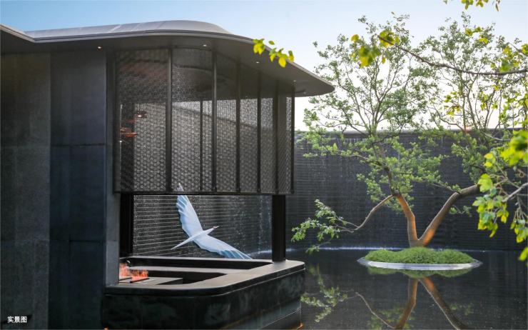 它汲取宋徽宗《瑞鹤图》,形成瑞鹤祥云的景观雕塑,同时将上海市花"白玉兰"灵感,融入景墙和门扉上。
