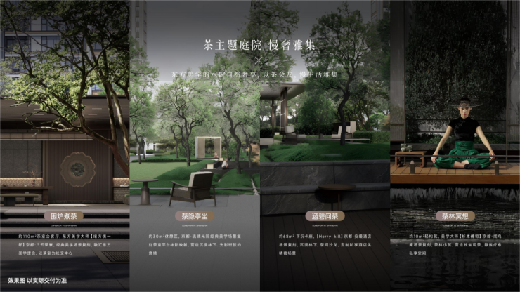 约3万方茶宴雅集主题园林,中央艺境,定制五雅生活。围炉煮茶,茶林冥想,云亭赏石,在自然中营造东方雅奢意蕴。