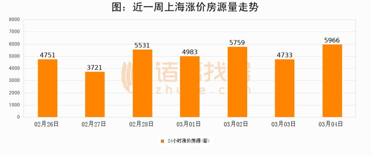 根据诸葛找房数据显示,上海24小时涨价房源量为5966套,较03月03日增加1233套,环比上涨26.1%。与此同时,涨价房源占比小幅扩大,业主信心有所提升。