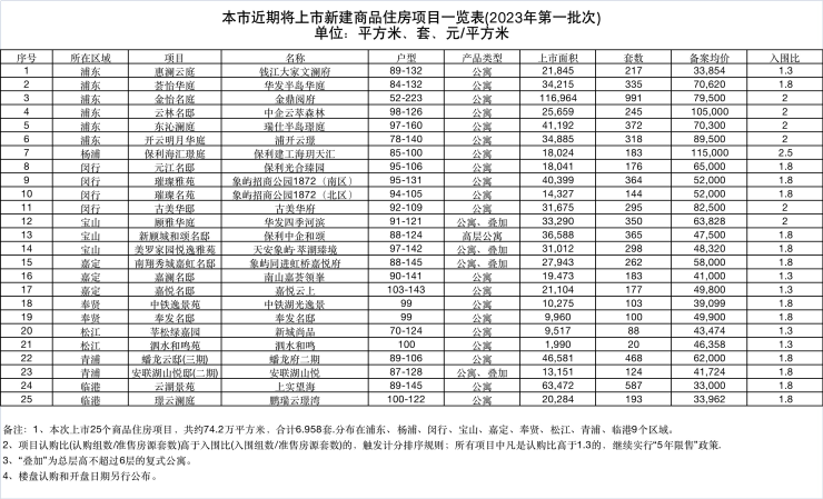 本次上市25个商品住房项目,共约74.2万平方米,合计6.958套.分布在浦东、杨浦、闵行、宝山、嘉定、奉贤、松江、青浦、临港9个区域。