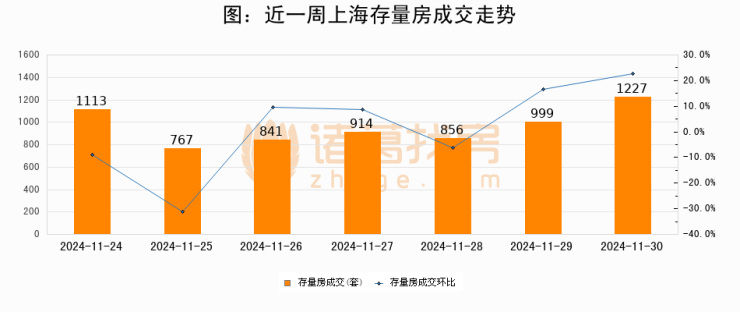 从存量房来看,2024年11月30日上海存量房单日成交1227套,比昨日增加228套,环比上涨22.8%。从近一周存量房成交来看,上海存量房日均成交套数为959套,11月30日单日成交1227套,高于近一周平均水平27.9%。
