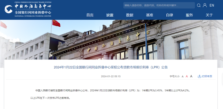 中国人民银行授权全国银行间同业拆借中心公布,2024年1月22日贷款市场报价利率(LPR)为:1年期LPR为3.45%,5年期以上LPR为4.2%。以上LPR在下一次发布LPR之前有效。
