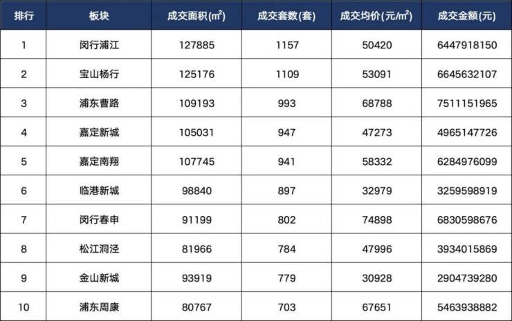 从板块成交排行榜看,闵行浦江(127885㎡)、宝山杨行(125176㎡)、浦东曹路(109193㎡)、嘉定新城(105031㎡)、嘉定南翔(107745㎡)表现稳健,成交面积均突破10万平方米,成为外环外市场的领头羊。