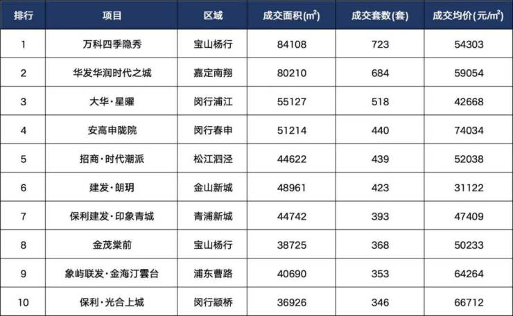 再看项目成交榜,万科四季隐秀(宝山杨行)以723套成交位居榜首,成交面积84108㎡,均价54303元/㎡;华发华润时代之城(嘉定南翔)以684套紧随其后,均价59054元/㎡;大华·星曜(闵行浦江)成交518套,均价42668元/㎡。