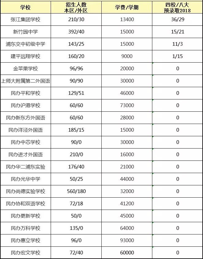 2018浦东公办四校八大预录取表