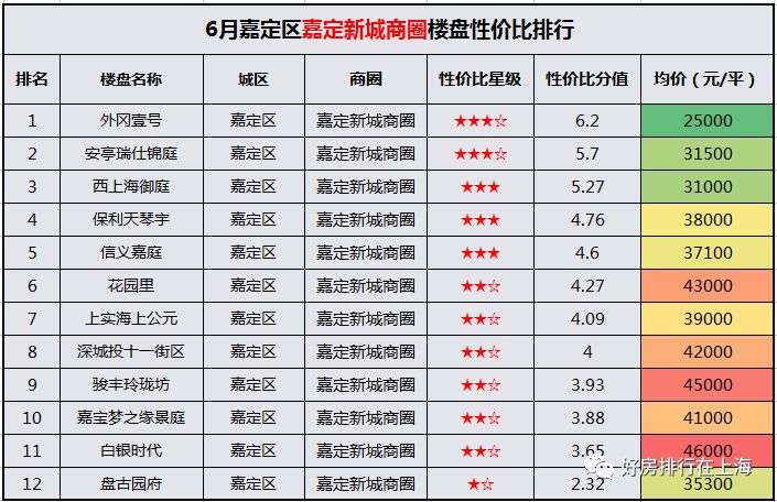 下面是6月嘉定新城在售楼盘性价比排行,在售12个楼盘均价37825元/平,平均性价比4.39分,均价略高于嘉定老城(34000元/平,平均性价比3分),但综合性价比高出至少1星级。结合后续规划,的确是在上海北部置业不错的选择。