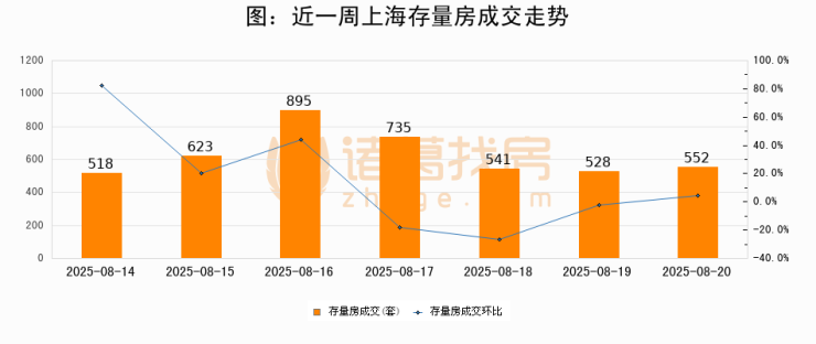 从存量房来看,2025年08月20日上海存量房单日成交552套,比昨日增加24套,环比上涨4.5%。从近一周存量房成交来看,上海存量房日均成交套数为627套,08月20日单日成交552套,低于近一周平均水平12%。