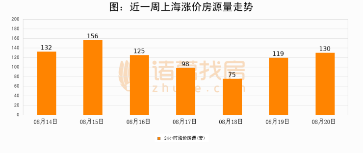 根据诸葛找房数据显示,上海24小时涨价房源量为130套,较08月19日增加11套,环比上涨9.2%。与此同时,涨价房源占比小幅扩大,业主信心有所提升。