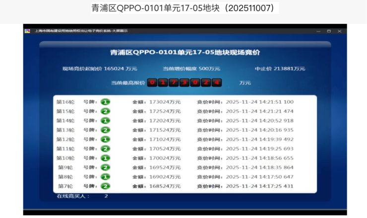 11月24日下午,上海第九轮土拍最后一宗住宅用地青浦区QPPO-0101单元17-05地块正式出让。