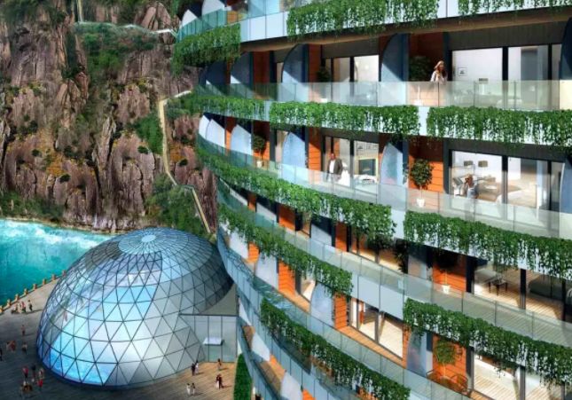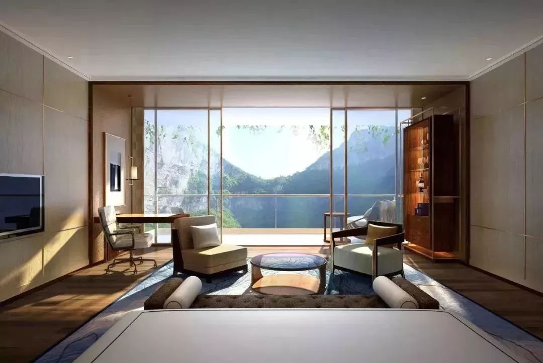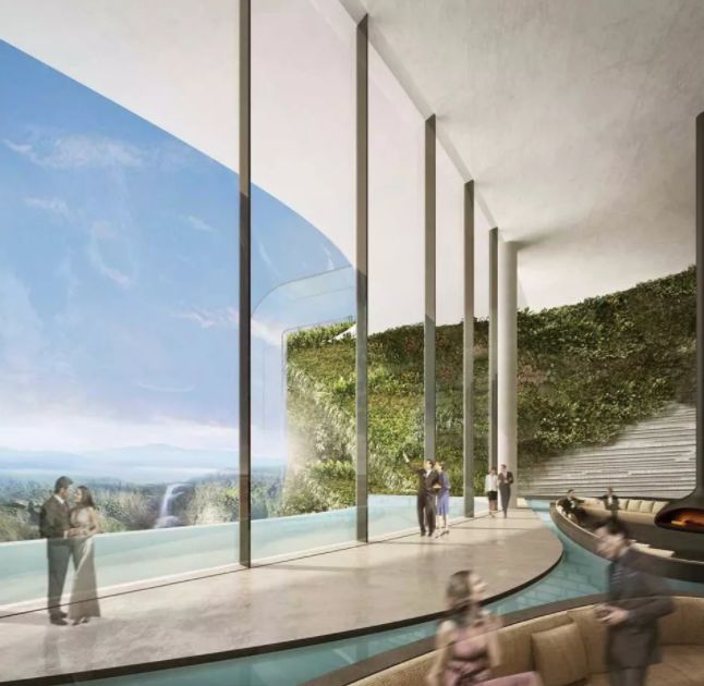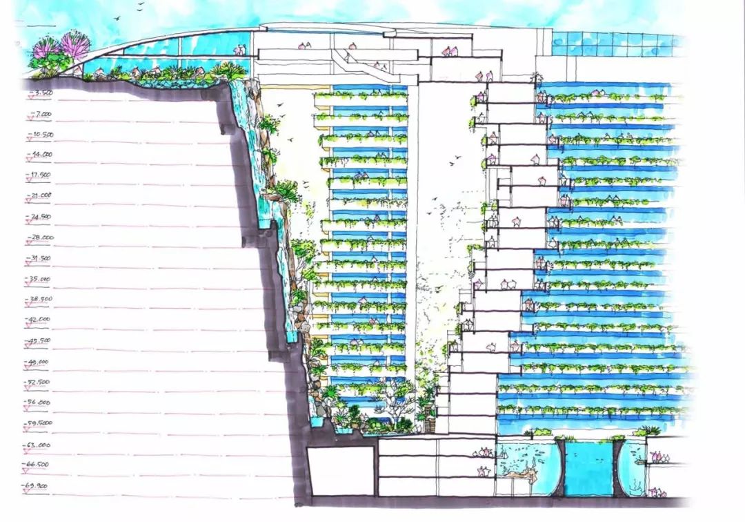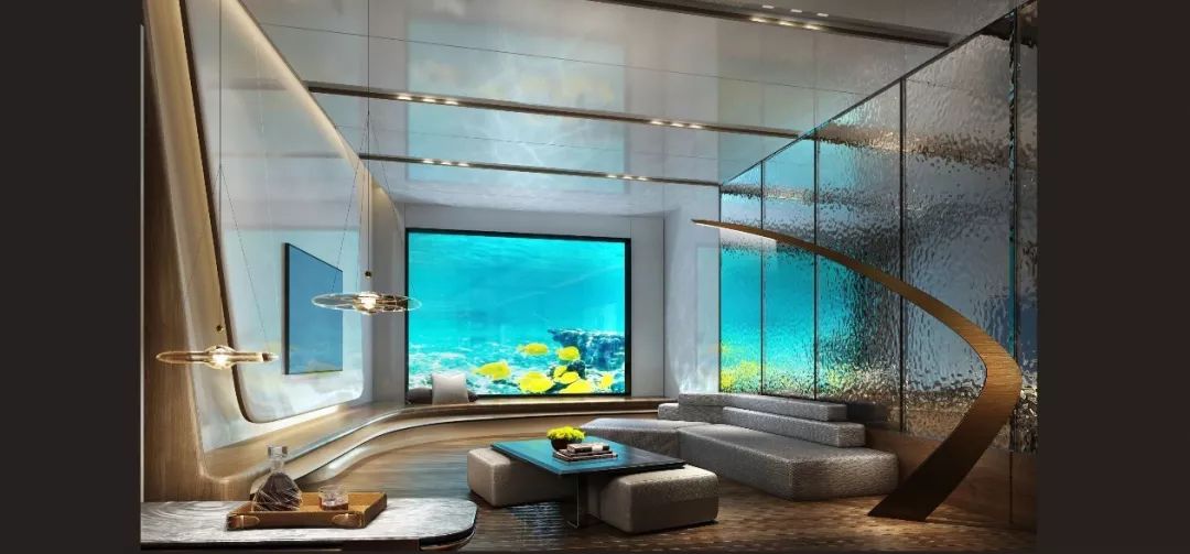 80米高的玻璃瀑布幕墙,负15层的水下复式套房,望尽朝露晨光的露台,长80米的玻璃栈道……