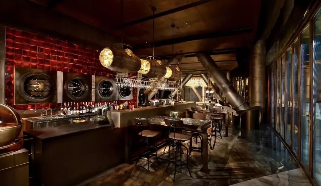 此外,赤酒吧位于酒店的B14层,介于坑底与水面之间,内部光影结合,让人联想到深坑崖壁内的岩石以及昏暗光线下的矿坑。粗硬的钢结构水管、红色水晶立面、红色皮革、定制木桶酒架……这些元素使酒吧的矿洞工业风愈发浓郁。