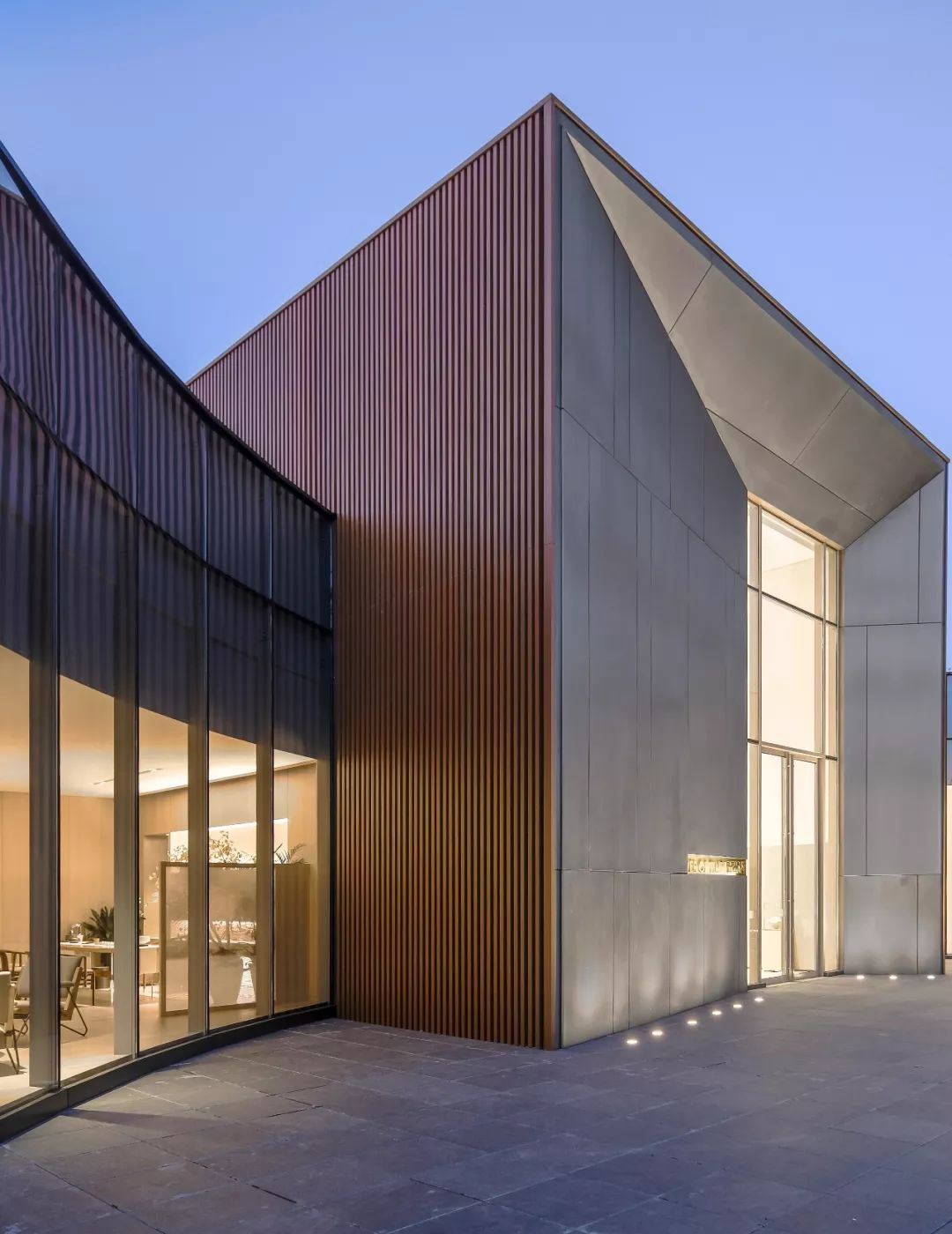 大面积黑白灰的运用使得建筑本身的雕塑感更为强烈,褐色的点缀带来温度感。而玻璃的穿插与水的流动则打消了可能的沉闷,水是轻盈,也是吸引,玻璃则联通室内外空间,带来光与影、空间与时间的对话。白天或者黑夜,自然亦或匠心,光的穿插给予这座雕塑空间通透之感,虚虚实实,似城市中一座浮岛。
