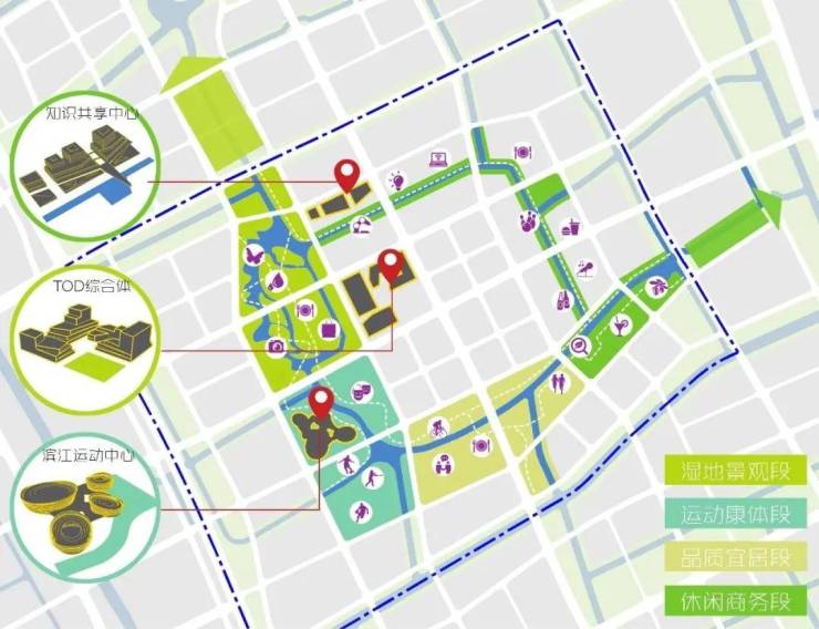 同时,规划充分重视生态环境保护与城市品质提升,依托现状水系与绿地资源,规划构建一条宽度约100—200米的生态活力纽带,串联滨水慢行系统与开放空间网络,推动自然生态与城市生活的有机融合,塑造高品质、人性化的城市人居环境。