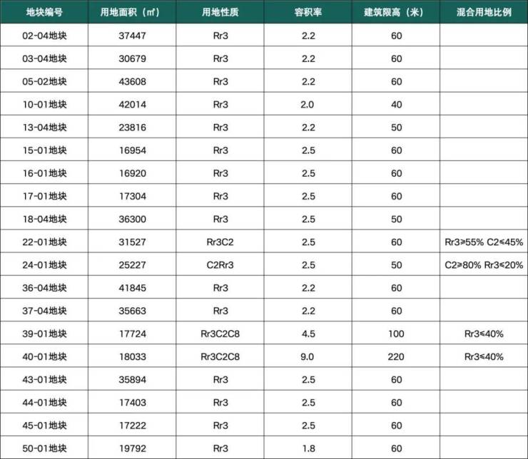 从规划中可以看到,片区内将新增19宗涉宅用地,其中15宗为纯宅地,容积率控制在1.8-2.5之间。另外2宗(22-01、24-01)为商业住宅用地,2宗(39-01、40-01)为商业办公住宅混合用地,住宅占比都偏低。