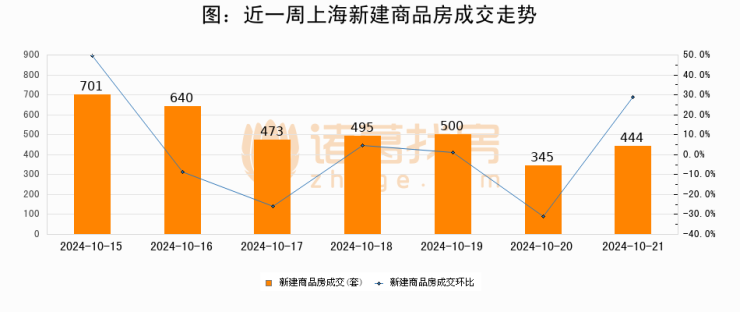 根据上海市房地产交易中心数据显示,2024年10月21日上海新建商品房成交444套,较昨日增加99套,环比上涨28.7%