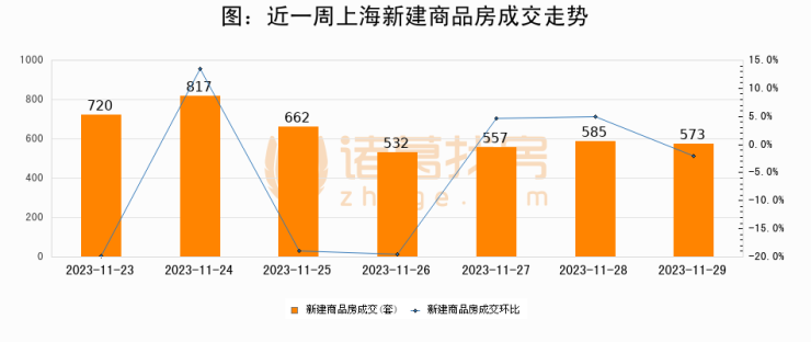 根据上海市房地产交易中心数据显示,2023年11月29日上海新建商品房成交573套,较昨日减少12套,环比下降2.1%