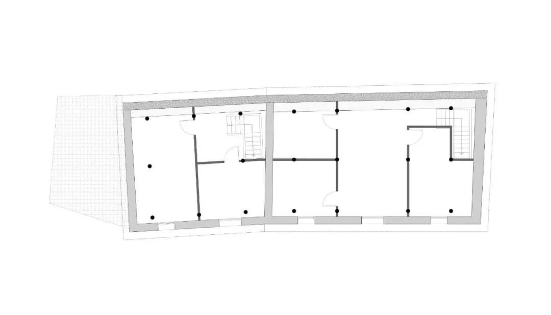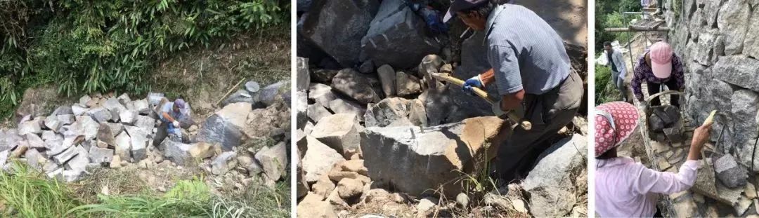 村庄内乡土民居顺应地形地貌,依山而建,多数房屋背靠山体的一侧,围护外墙直接采用毛石砌筑的护坡挡墙。设计中希望保留这一表达地域建造特点的构造。首先要对存在结构隐患的石墙修缮加固,确保结构稳定性;山地土层含水量高,石墙会出现渗水现象,在基础施工阶段,预埋排水管起到引流作用。石墙内部灌浆处理,填补缝隙,刷防水涂层,营造舒适的室内居住环境。