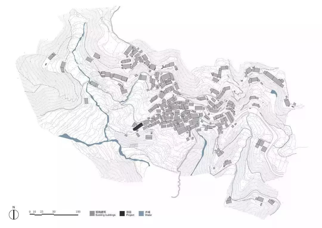 因此,line+在设计之初就制定了两种策略来回应上诉两个看似存在矛盾的诉求。在整个设计建造过程中,始终遵循两条平行的路径:一是对松阳民居聚落的乡土建构体系展开研究,梳理与当地自然资源、气候环境、复杂地形、生产与生活方式及文化特征相适应的空间型制和稳定的建造特征,为保护传统聚落风貌提供设计依据;二是运用轻钢结构体系和装配式建造技术,植入新的建筑使用功能,适应严苛的现场作业环境,满足紧迫的施工建造周期,同时提供较好的建筑物理性能。