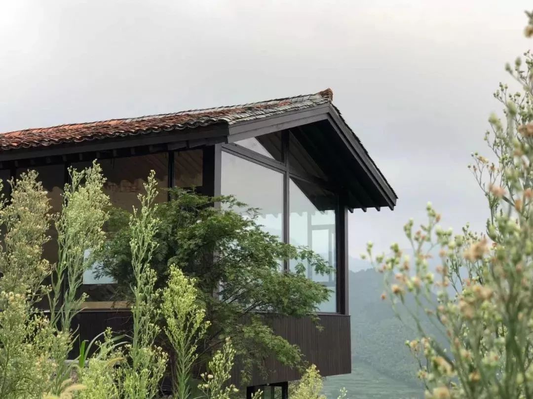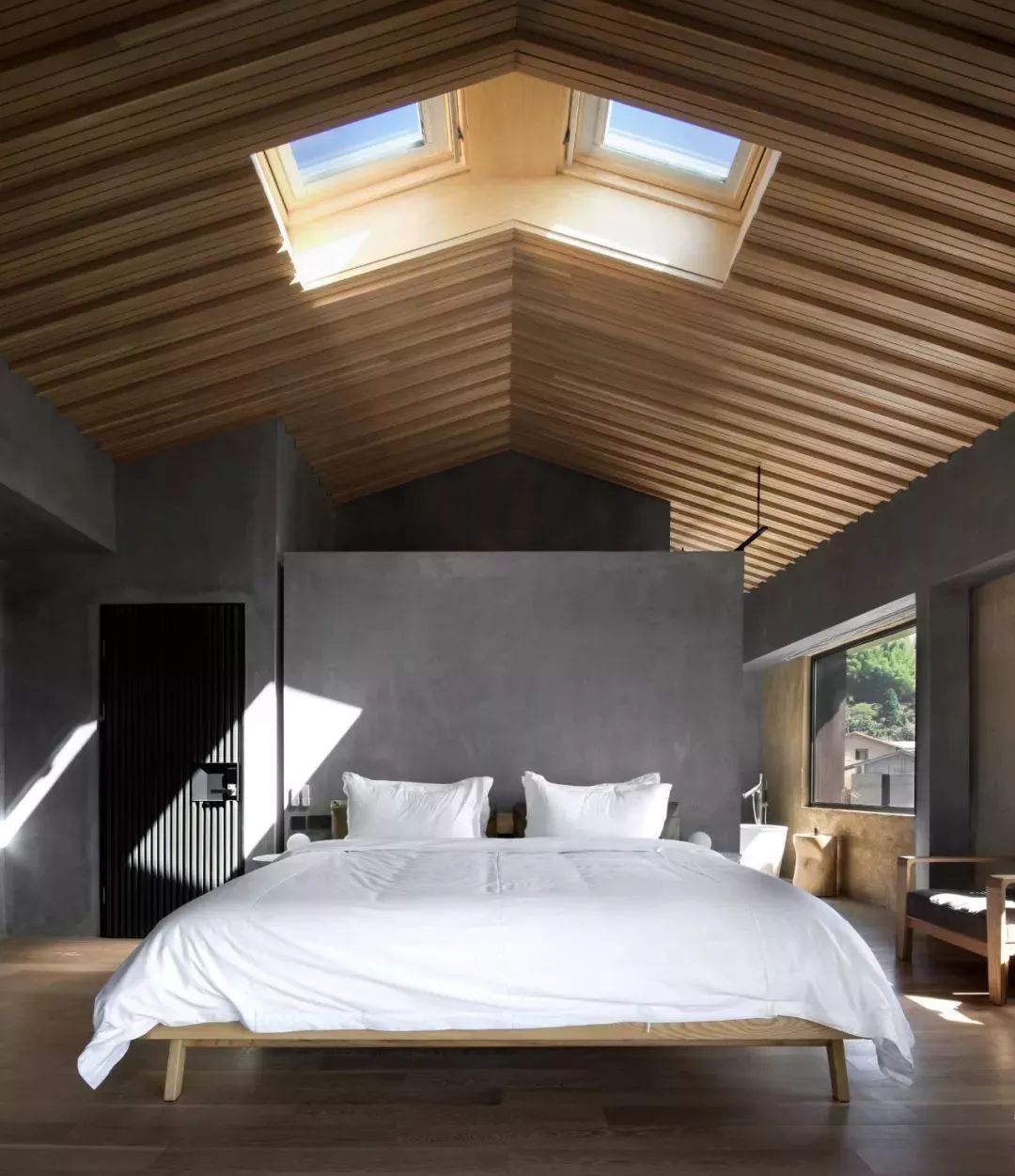 轻钢龙骨屋面填充eps发泡混凝土,上铺防水卷材。设计利用老建筑拆除的小青瓦作为面层,既回应了地域文化性,也体现了可持续的生态理念。到了夜晚,为了能让住客欣赏到高山上美丽的星空,床顶部的屋面加设了天窗。