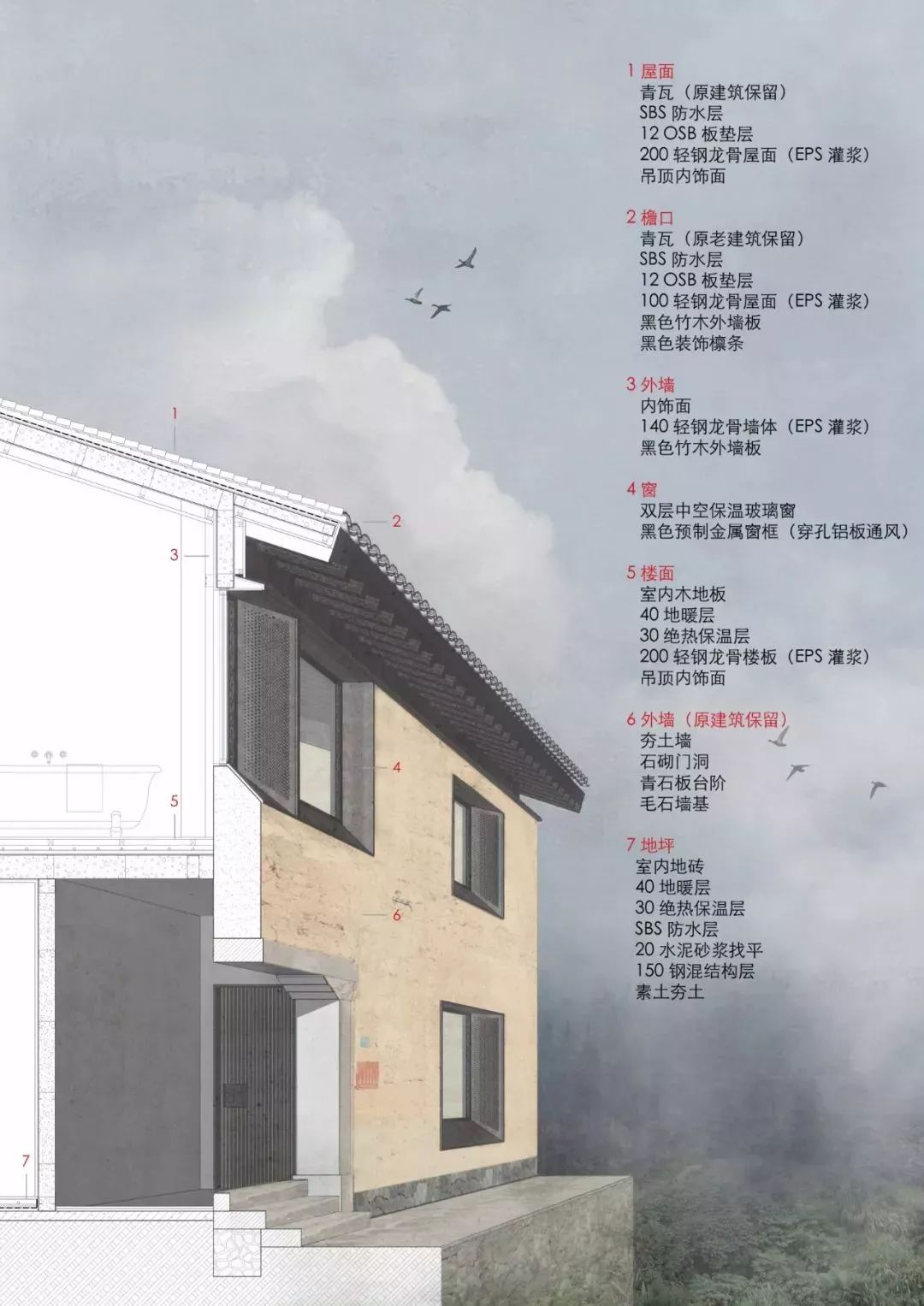 两栋民居夯土墙体保存较为完好,设计将其整体保留,原有建筑内部空间格局狭小,木屋架也已年久失修,拆除后,植入新型轻钢结构,并将新结构与保留的夯土墙体相互脱离,避免土墙承受新建筑的受力荷载。