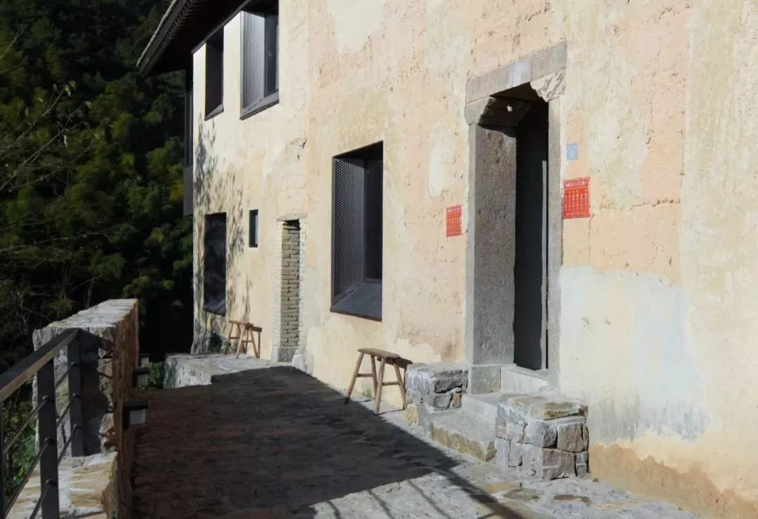 line+ 的任务是对位于村落西南侧的两栋传统民居进行改造。两栋民居是典型的浙南山地民居,三面夯土围合,一面紧靠毛石挡土墙,内部屋架为传统木结构。机动车辆到达村口便无法前行,步行约三百多米可抵达项目场地,但是村道蜿蜒曲折,石阶上下崎岖,路面最窄之处仅供一人通行。